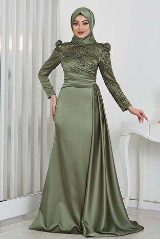Aplik İşlemeli Kuyruklu Rosa Saten Tesettür Abiye - Haki