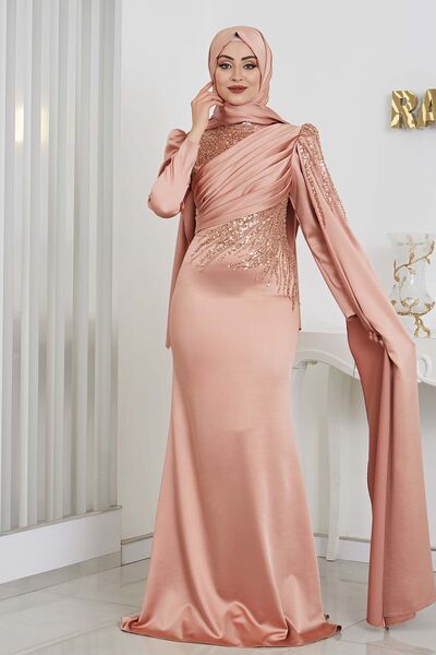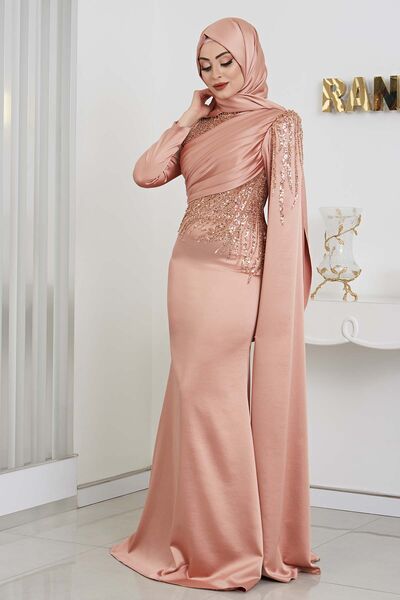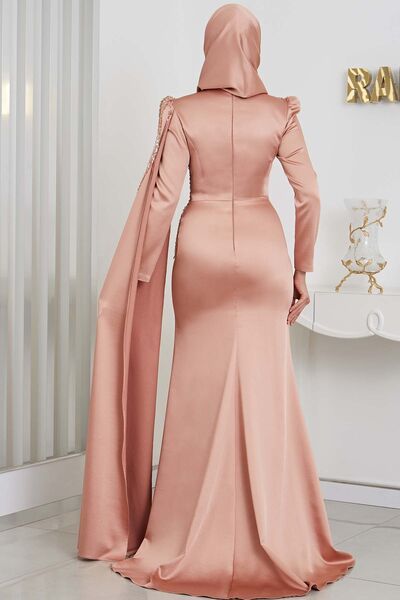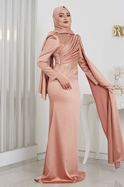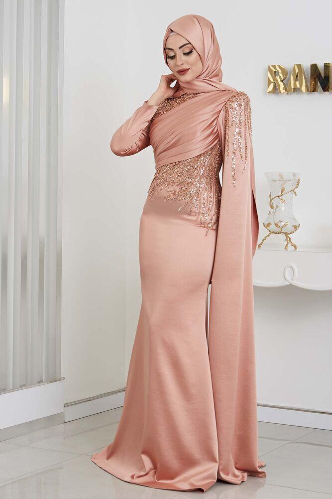 Faites-moi savoir quand il arriveBoncuk Detay Aplik İşlemeli Koldan Kuyruklu Noura Saten Tesettür Abiye