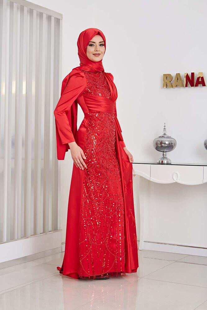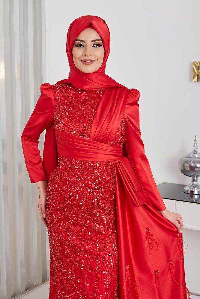 Boncuk Detaylı Drapeli Kuyruklu Dicle Saten Tesettür Abiye - Kırmızı