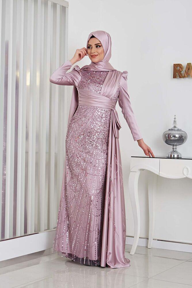 Boncuk Detaylı Drapeli Kuyruklu Dicle Saten Tesettür Abiye - Lila