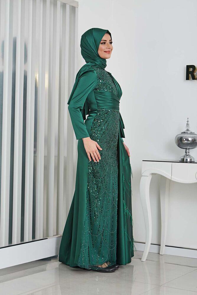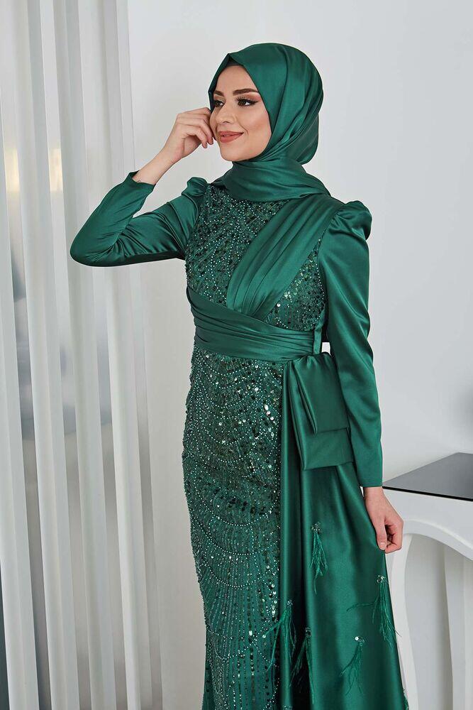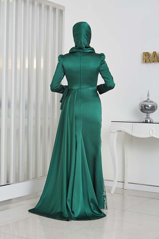 Boncuk Detaylı Drapeli Kuyruklu Dicle Saten Tesettür Abiye - Zümrüt