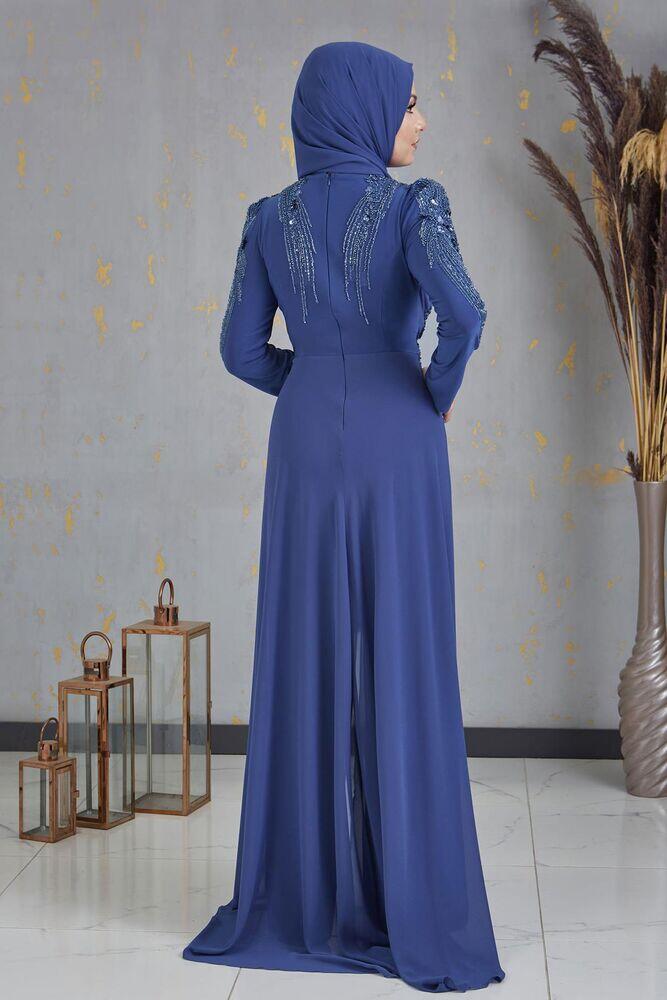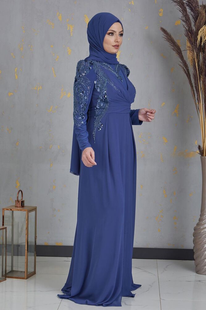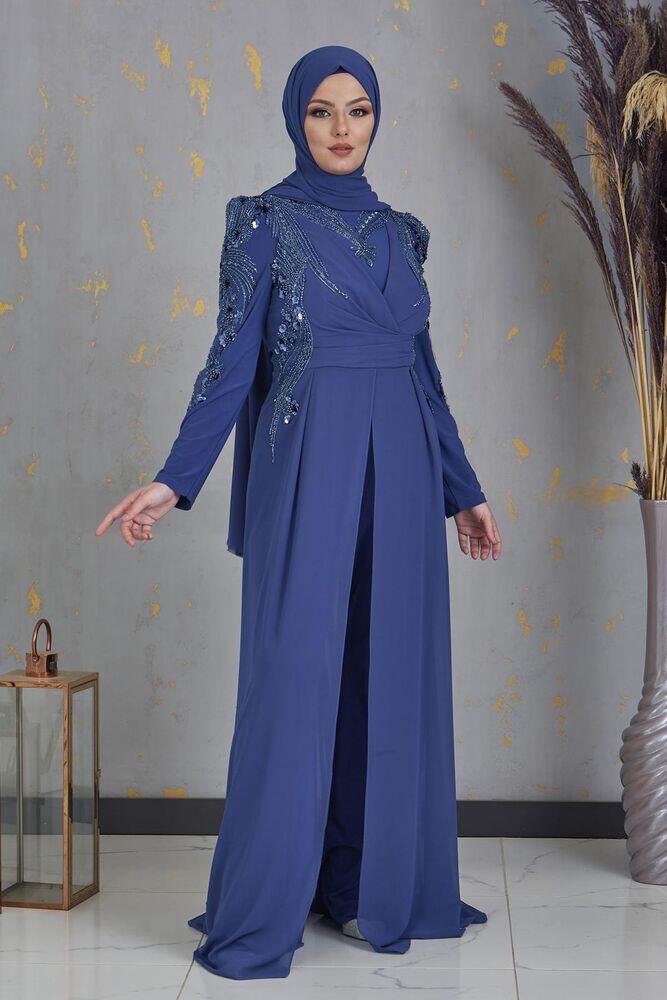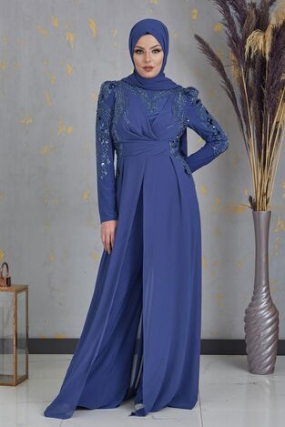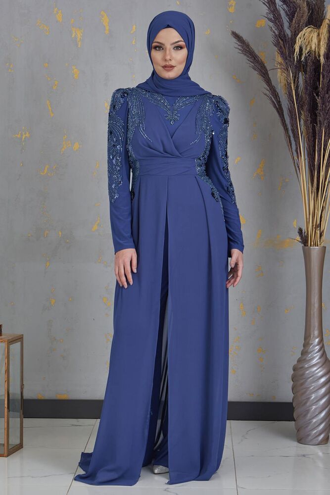 Boncuk İşlemeli Önü Piliseli Abiye Tesettür Uzun Şifon Tulum - İndigo - PNN2403