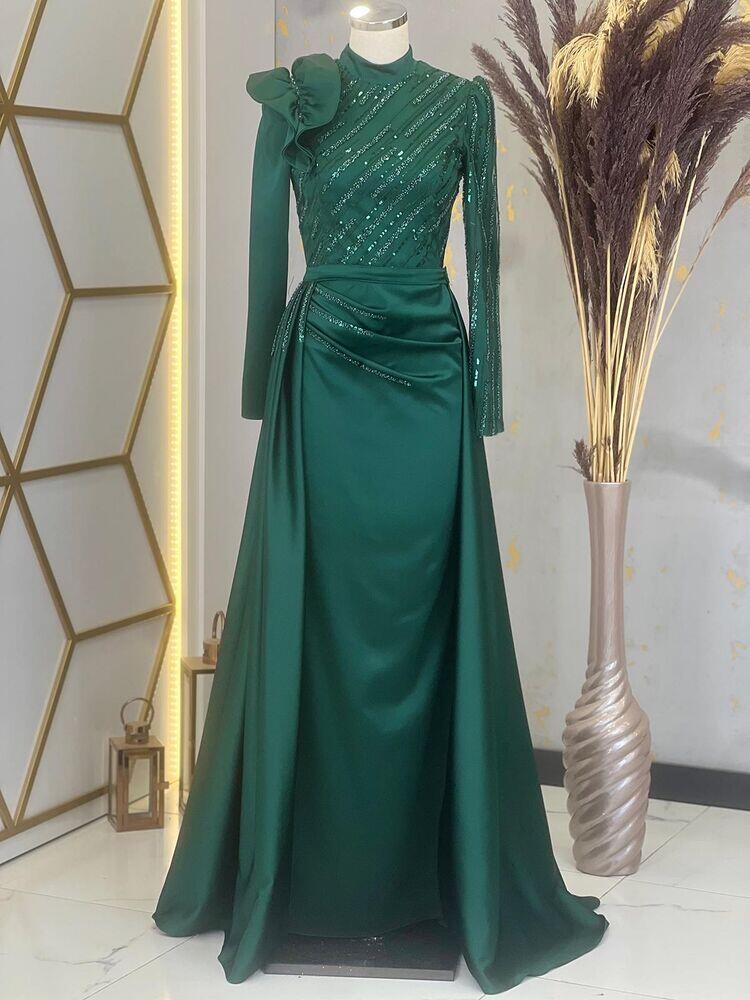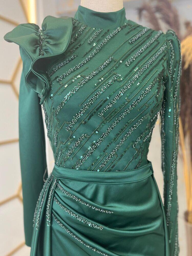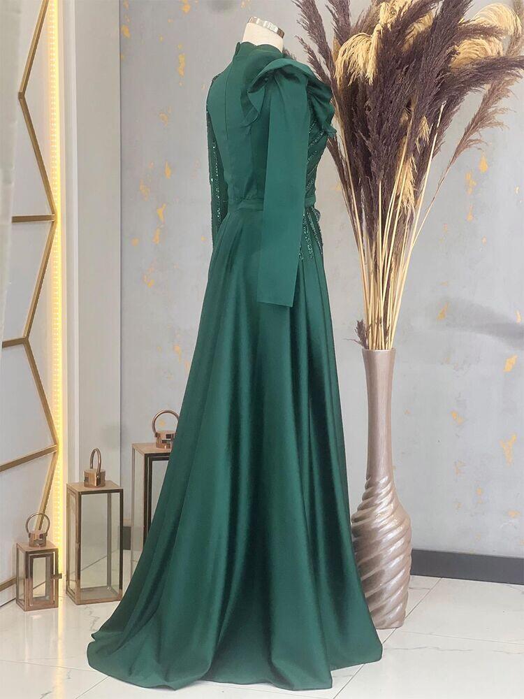 Boncuk İşlemeli Portatif Etekli Saten Uzun Tesettür Abiye - Yeşil - PNN2405
