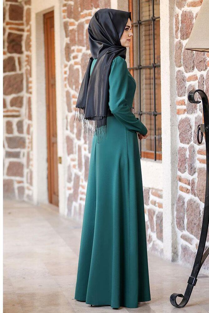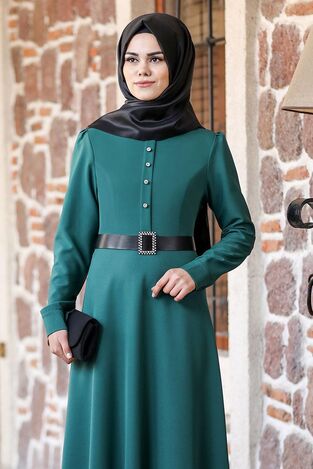 Düğmeli Masal ELbise Zümrüt - Ahunur Moda Tesettür Giyim - AHN1003