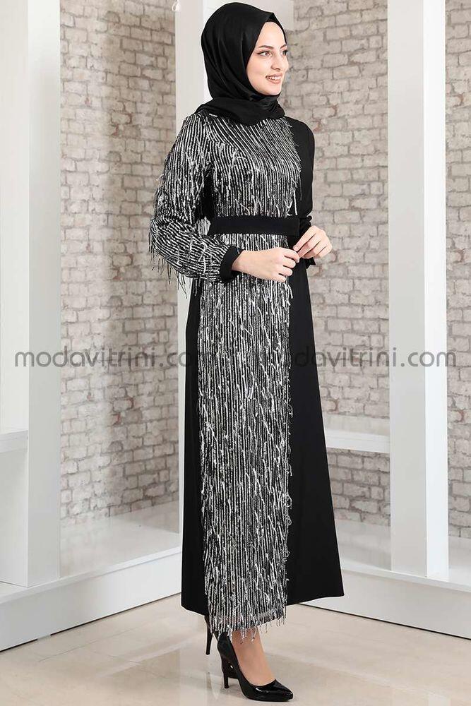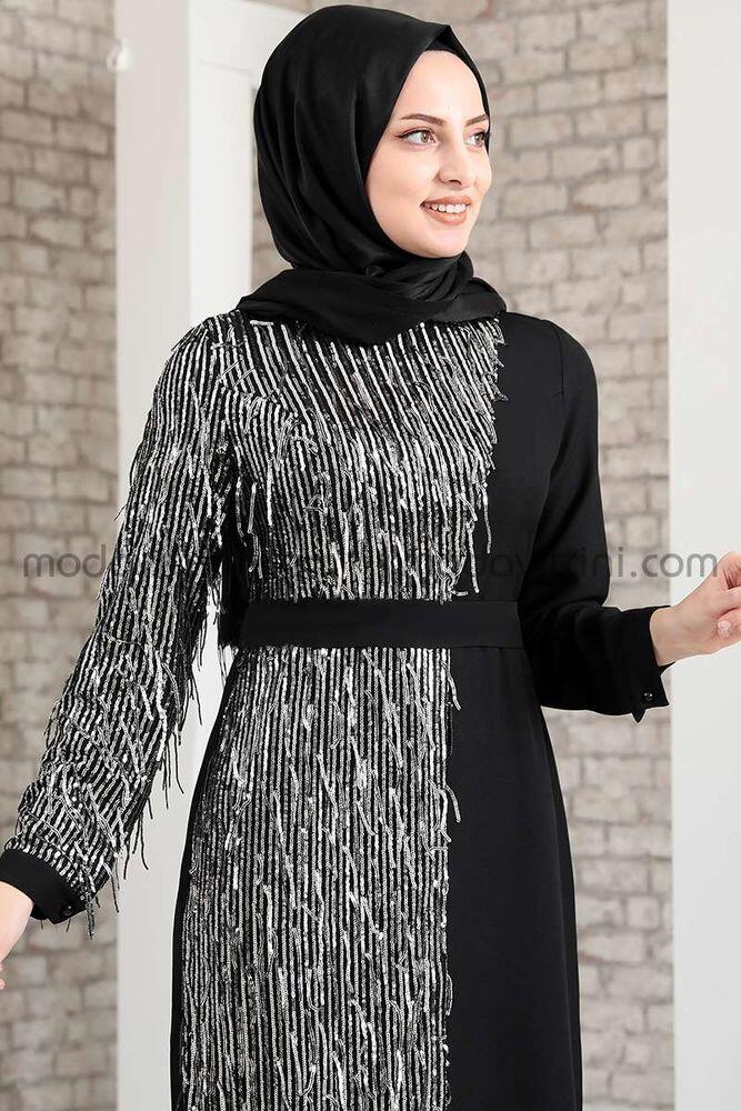 Firuze Dress - Fringed - Black & Silver - MDV2039 |