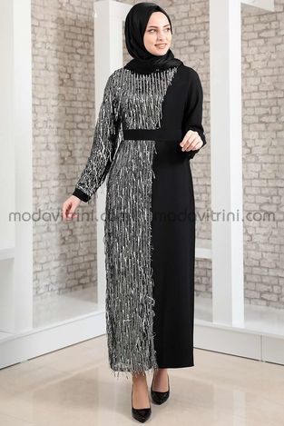Firuze Saçaklı Elbise Siyah & Gümüş - MDV Collection |