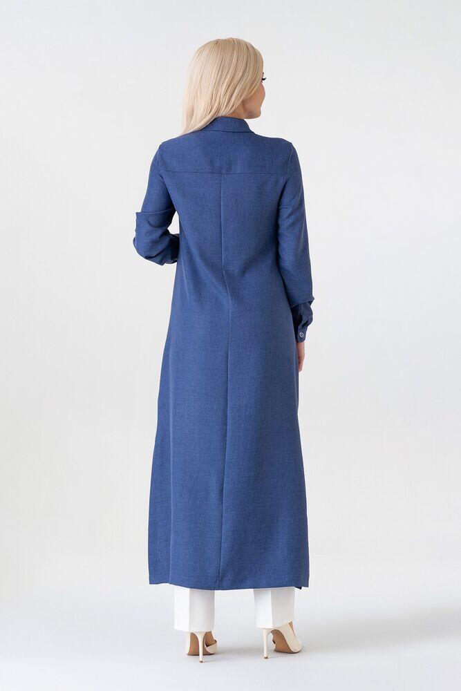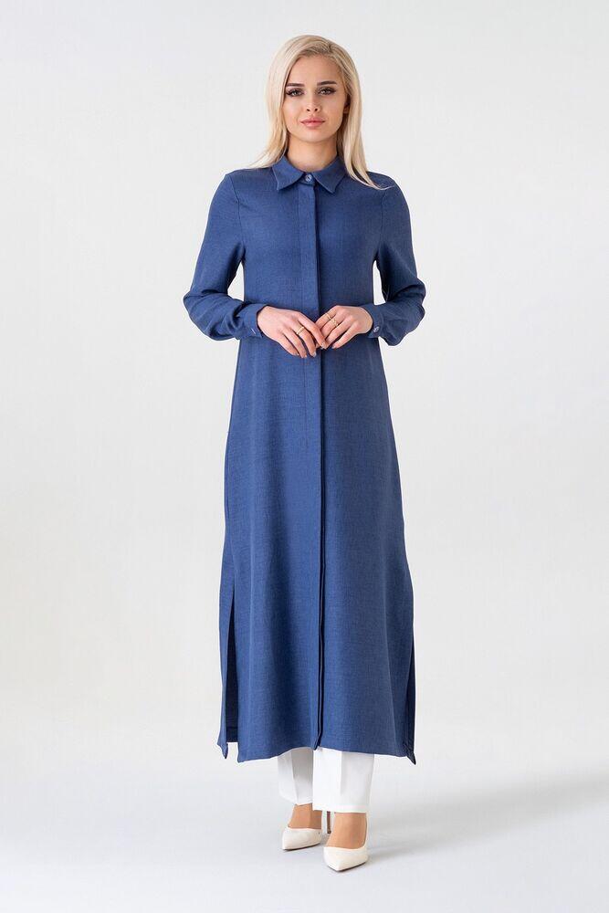 Gizli Patlı Uzun Tunik Keten Görünümlü - İndigo - FSC3140
