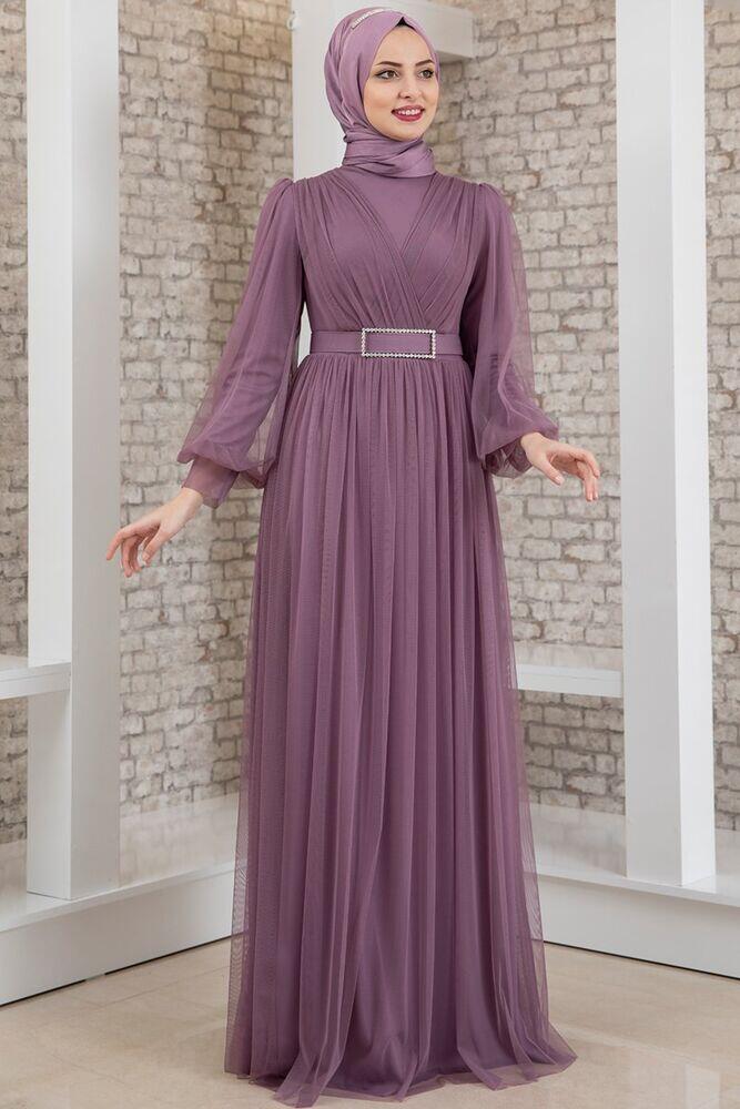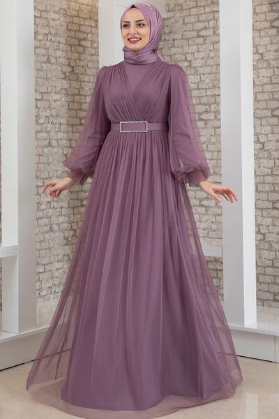 Robe de Soirée - Tulle Détaillé - Ceinture Détaillée Pierre - Lilas - MDV2042 |