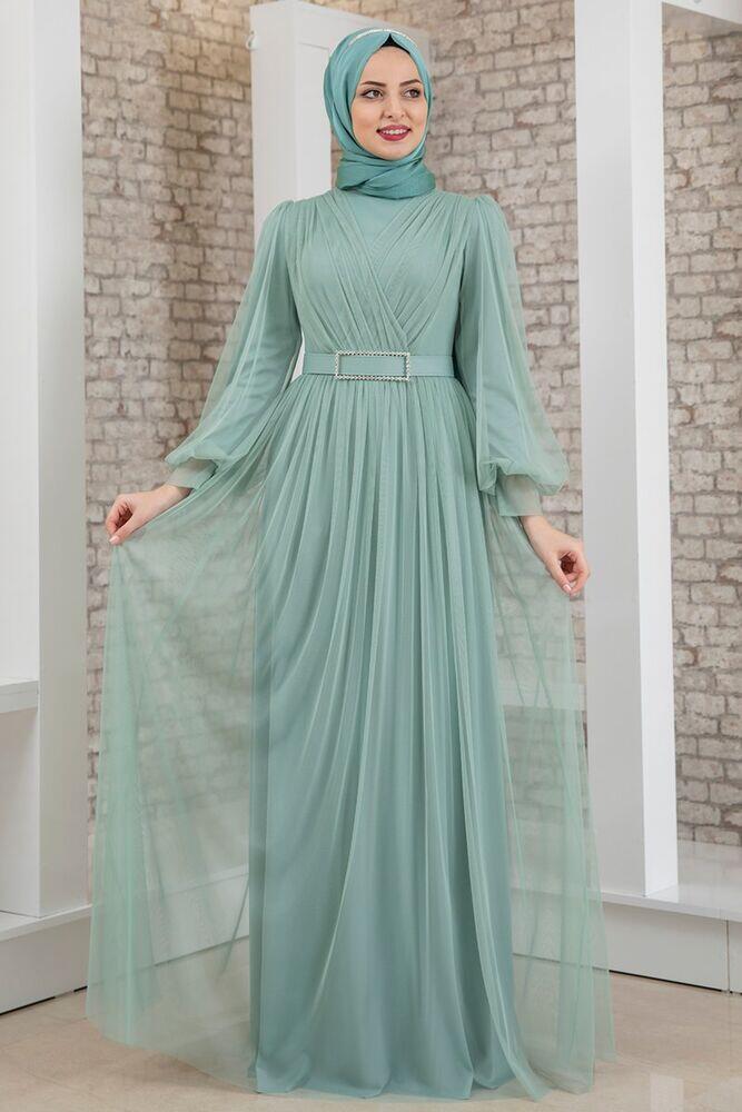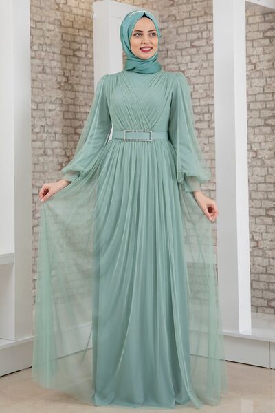Kemeri Taşlı Tül Detay Abiye Mint - Fashion Showcase |