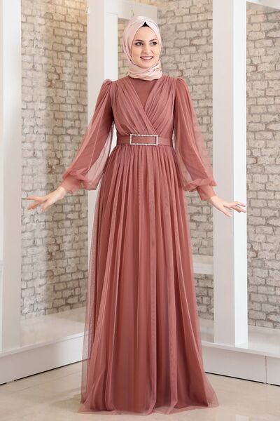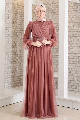 Kemeri Taşlı Tül Detay Abiye Soğan Kabuğu - Fashion Showcase |