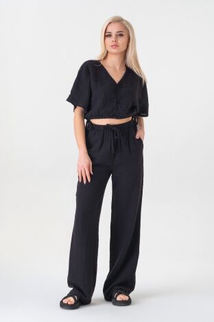 Müslin %100 Doğal Pamuk Beli Lastikli Bol Paça Pantolon - Siyah - WNR25103