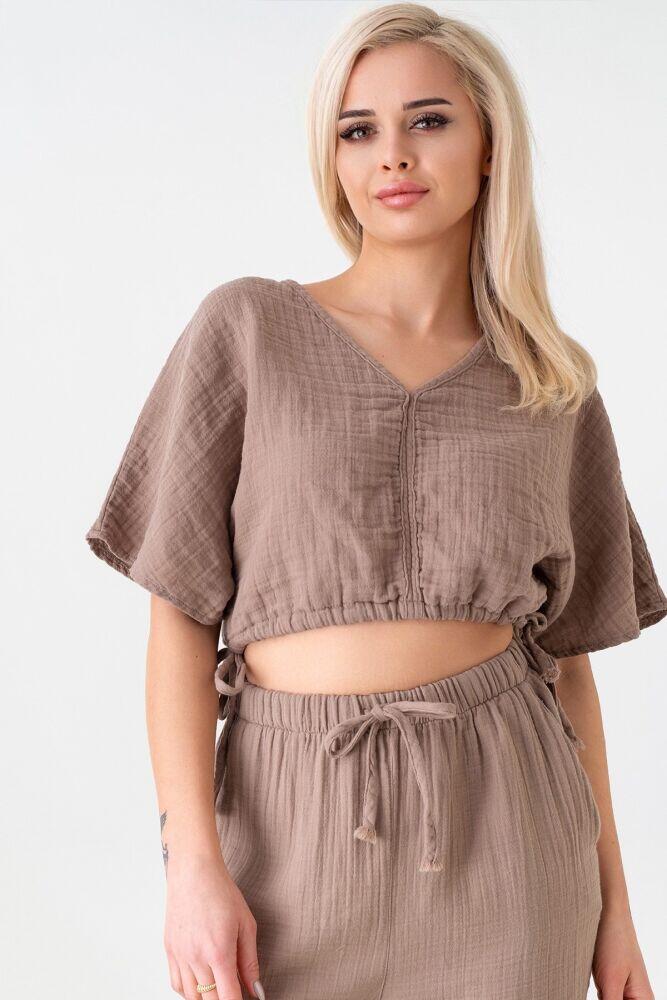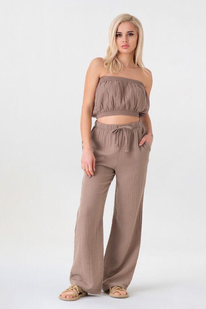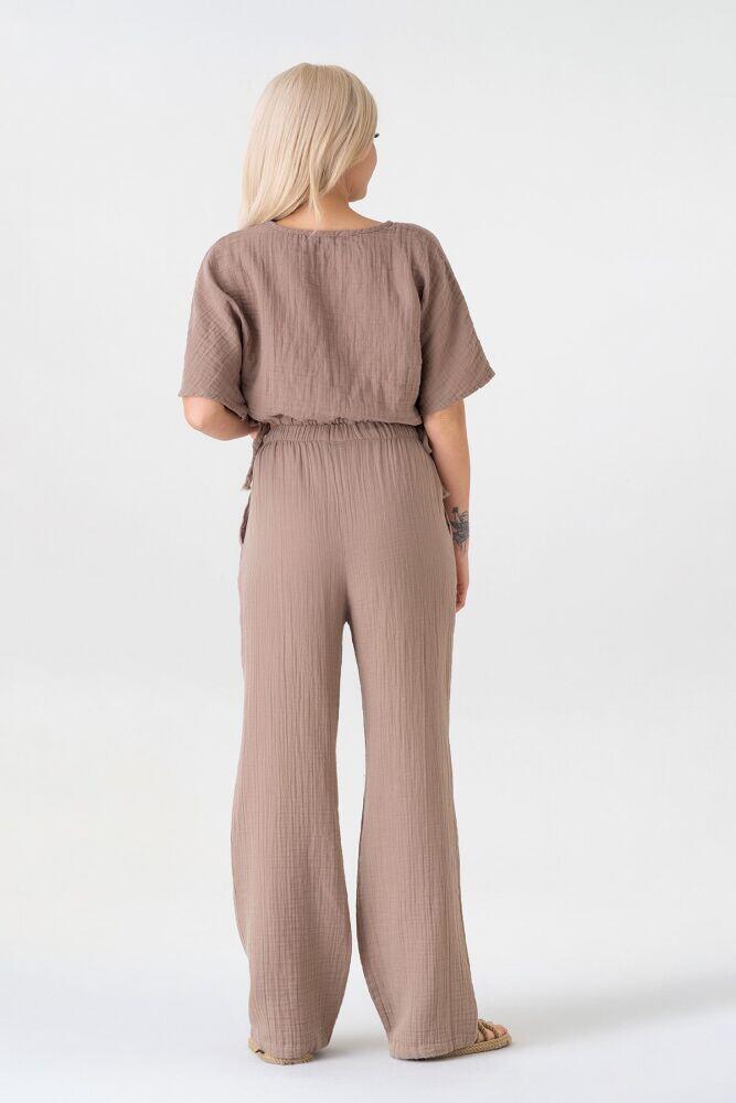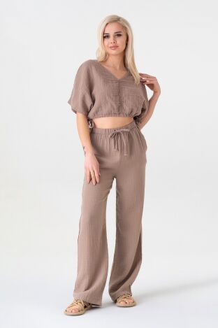 Müslin %100 Doğal Pamuk Beli Lastikli Bol Paça Pantolon - Vizon - WNR25103