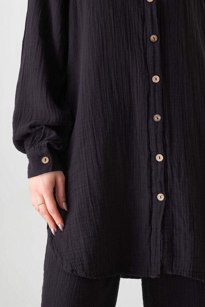 Müslin organik %100 Pamuk kumaştan üretilmiştir. Natural yapısı sayesinde geri dönüşümü destekler. Düğmeleri organik hindistan cevizi kabuğundan üretilmiş olan müslin kadın gömlek tüm yaş gruplarına yaz aylarında kaliteli vakit geçirmeyi garanti eder. Tesettür gömlek olarak da kullanılabilir ve tüm alanlara hitap eder.