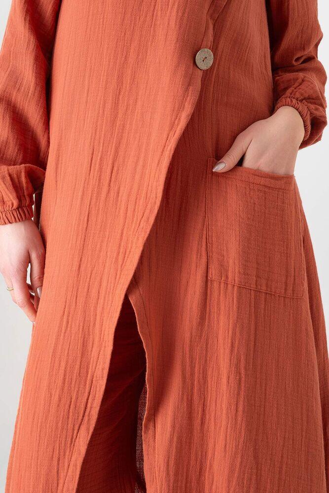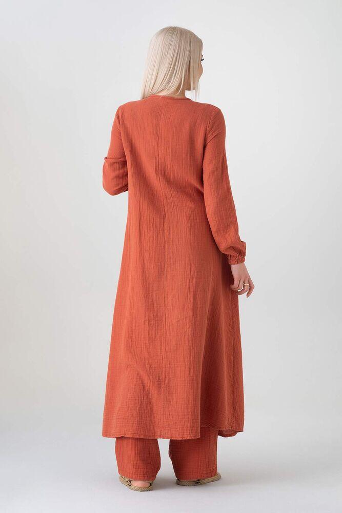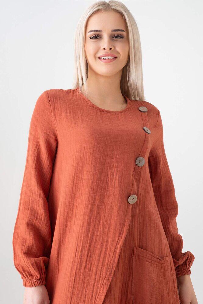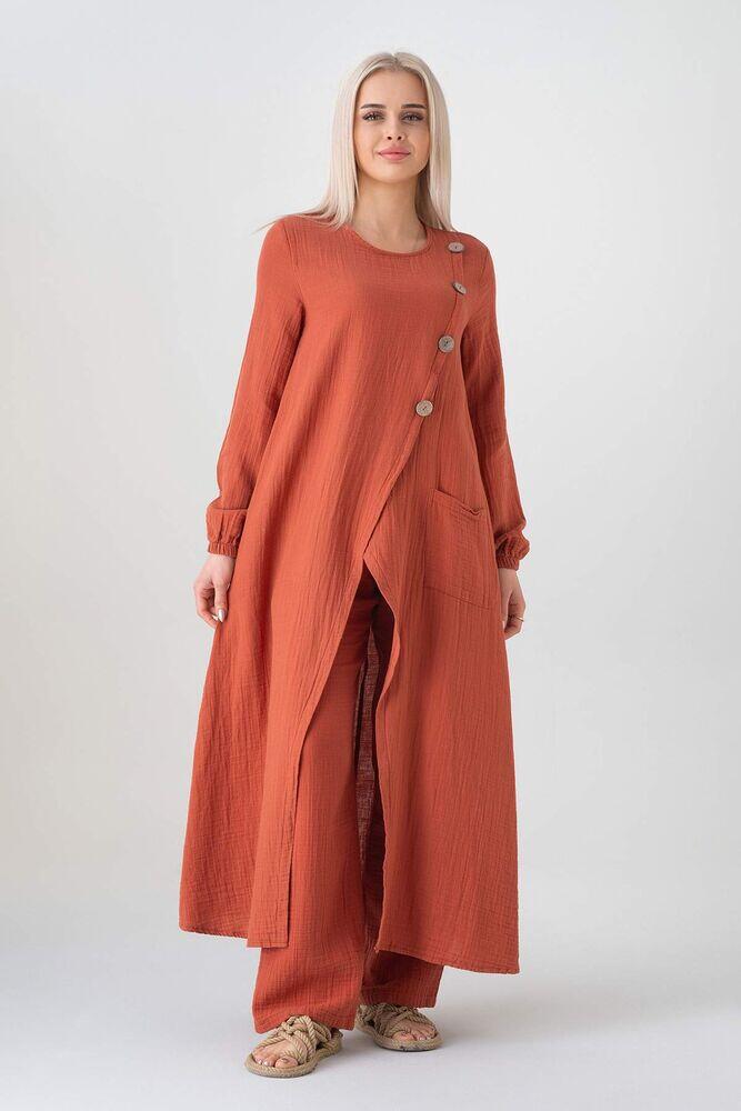 Notify me when its in stockMüslin Kumaş Düğme Detay Önden Yırtmaçlı %100 Pamuk Yazlık Tesettür Tunik;
