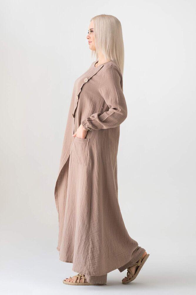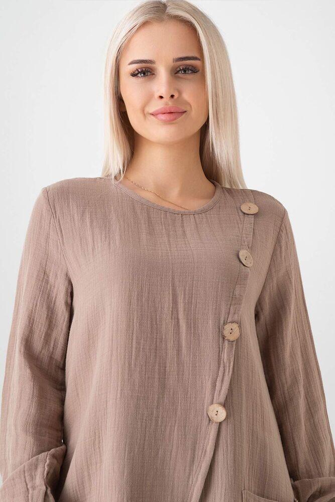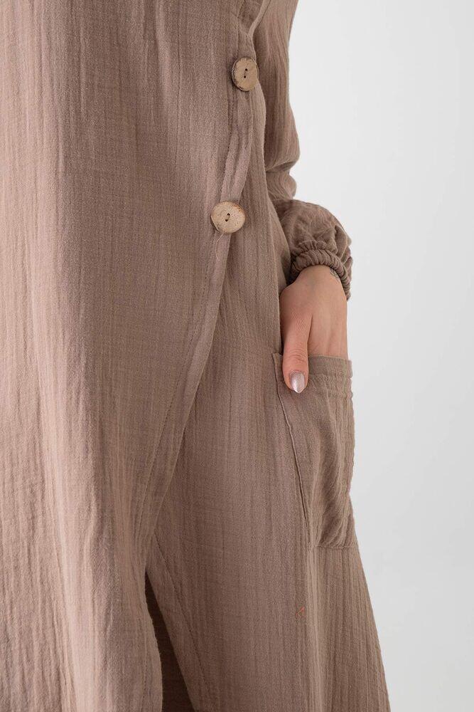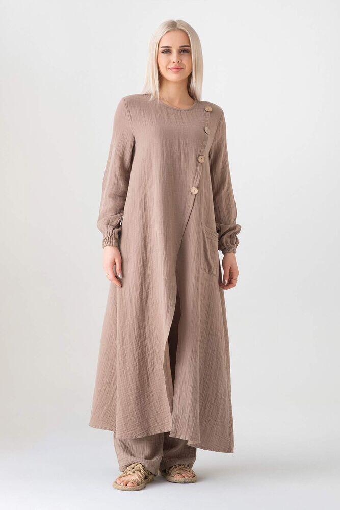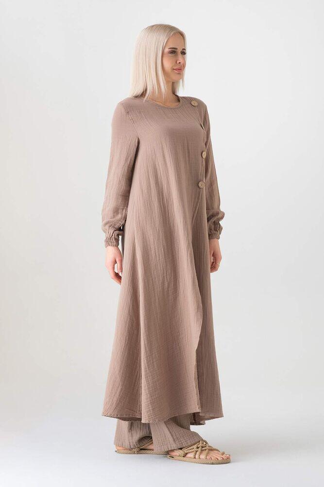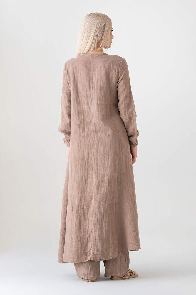 Müslin Kumaş Düğme Detay Önden Yırtmaçlı %100 Pamuk Tesettür Tunik - Vizon - WNR2502