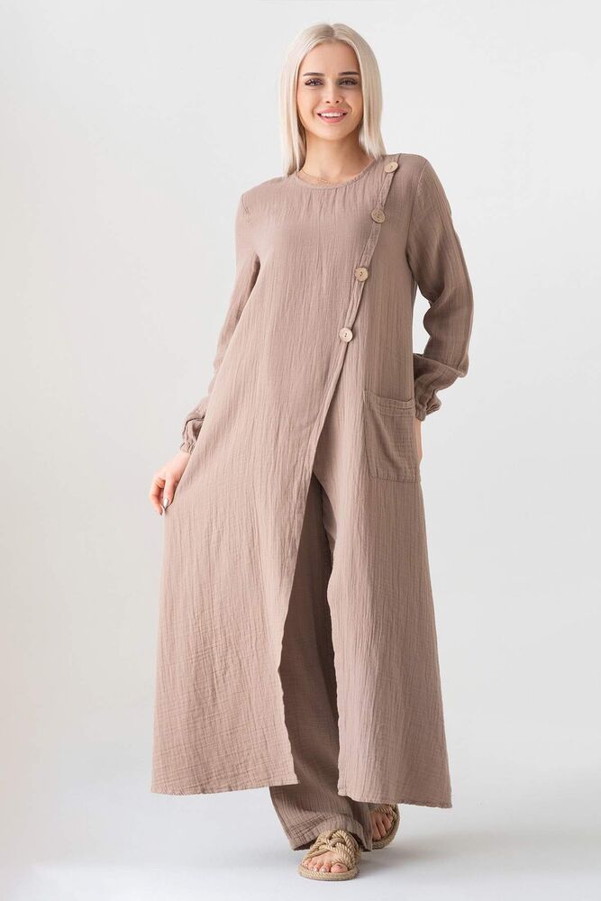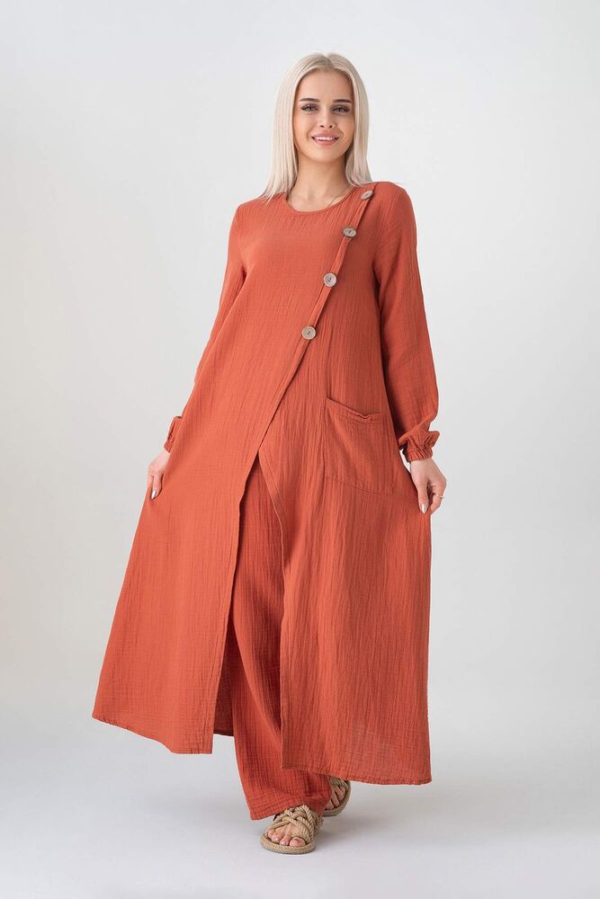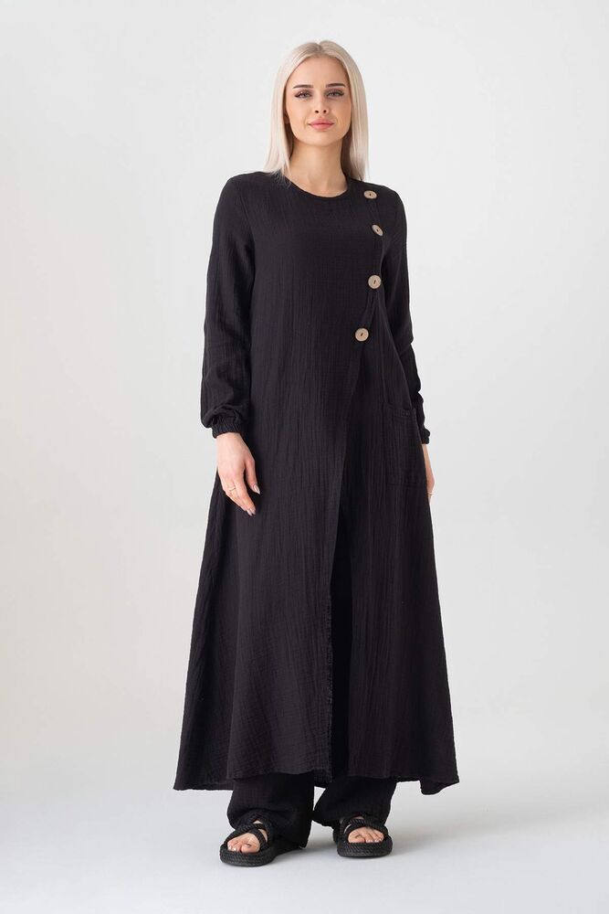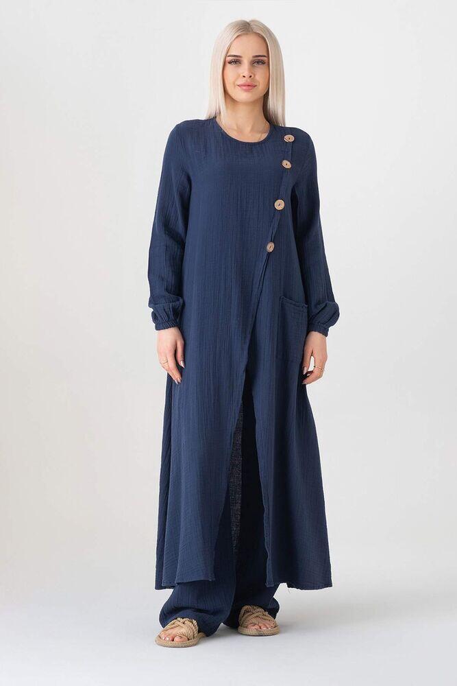 Müslin Kumaş Düğme Detay Önden Yırtmaçlı %100 Pamuk Yazlık Tesettür Tunik;