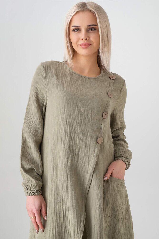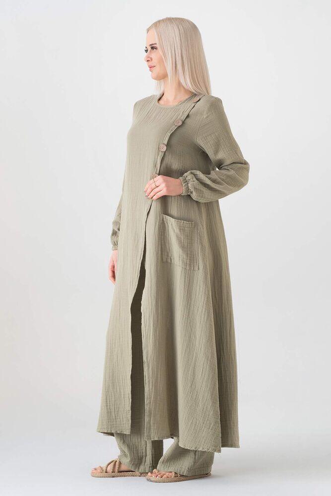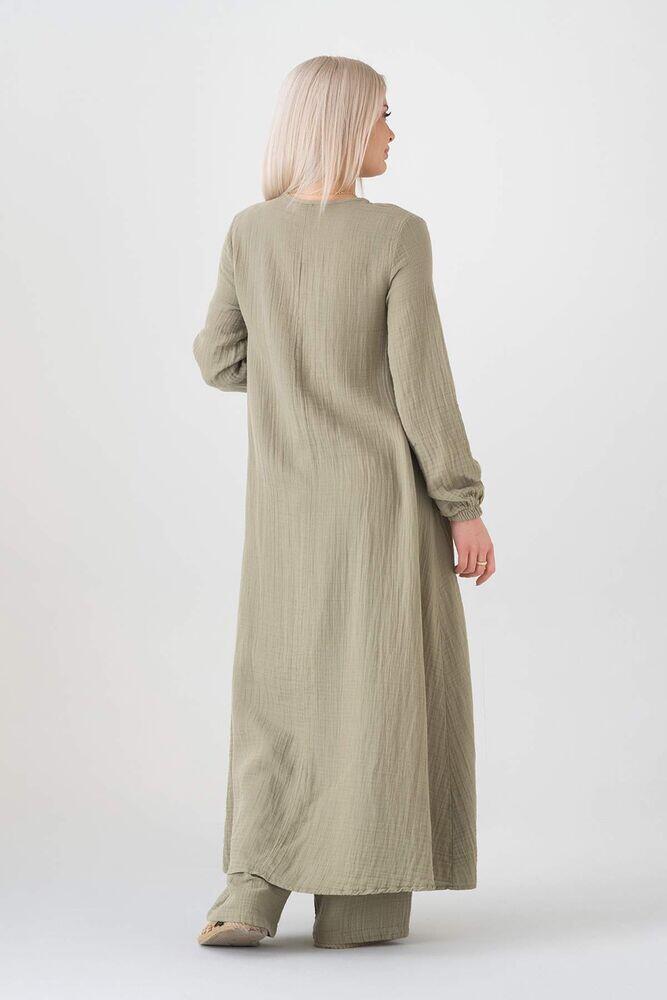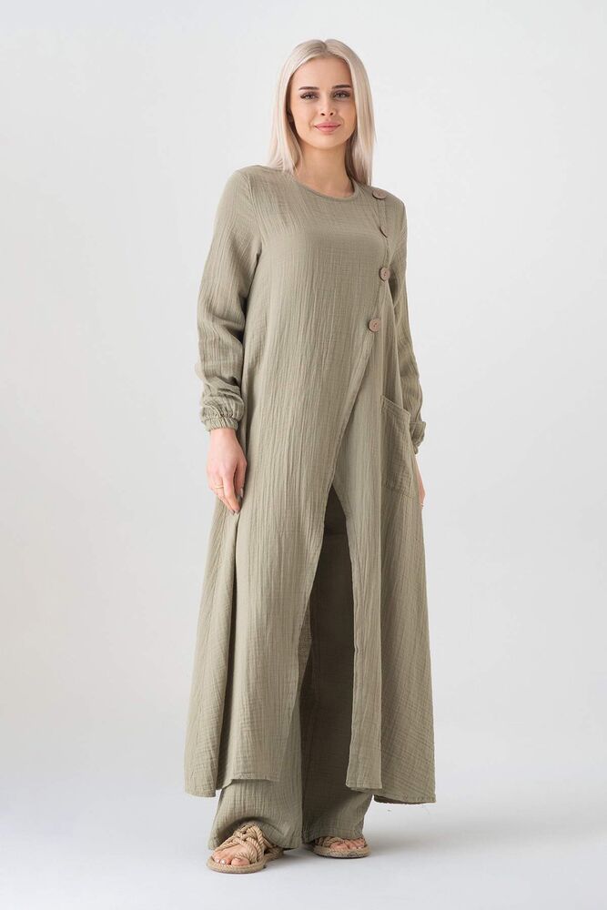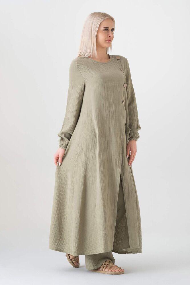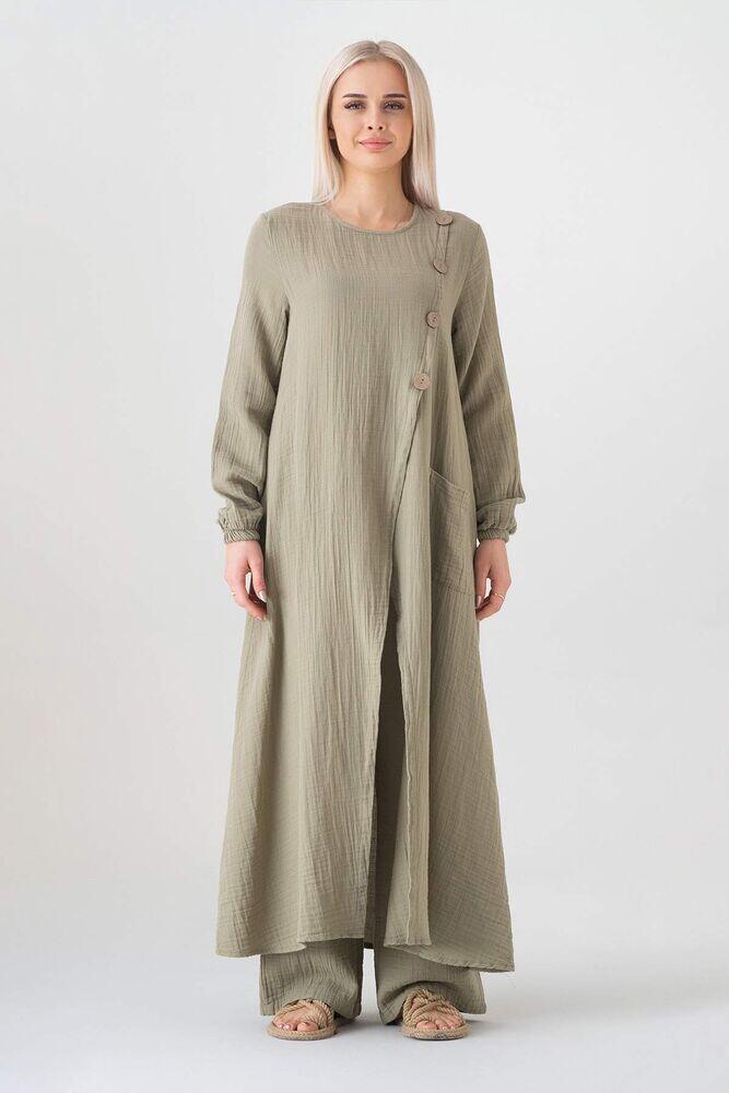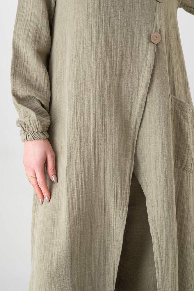Müslin Kumaş Düğme Detay Önden Yırtmaçlı %100 Pamuk Tesettür Tunik - Yeşil - WNR2502