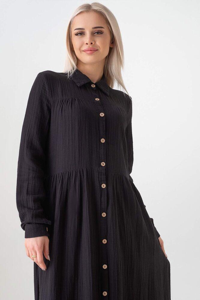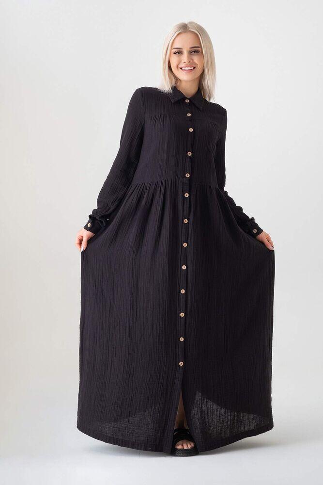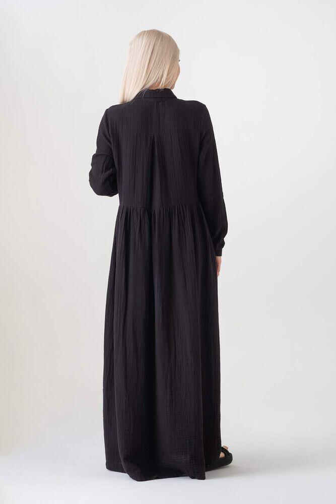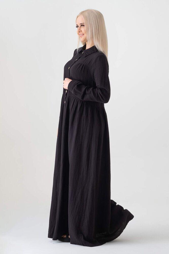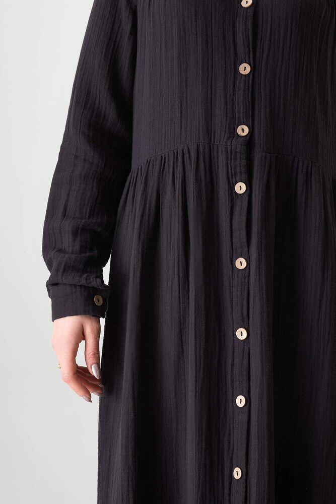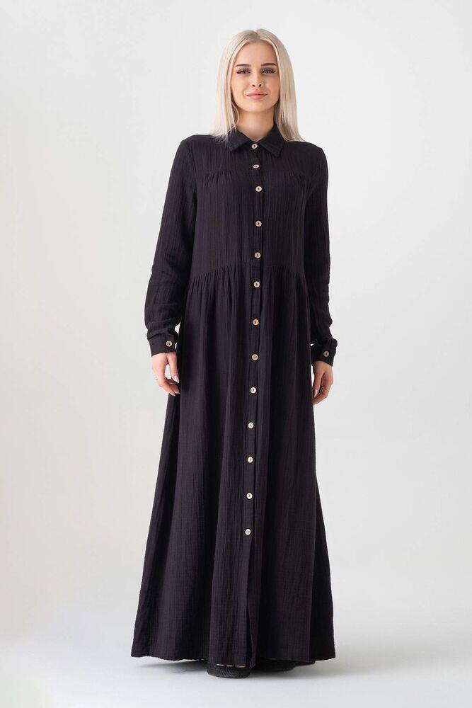 Müslin Kumaş Önden Düğmeli %100 Doğal Pamuk Kumaş Yazlık Uzun Tesettür Elbise - Siyah - WNR2521