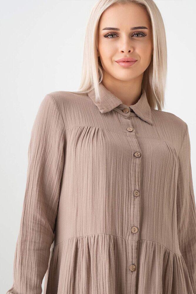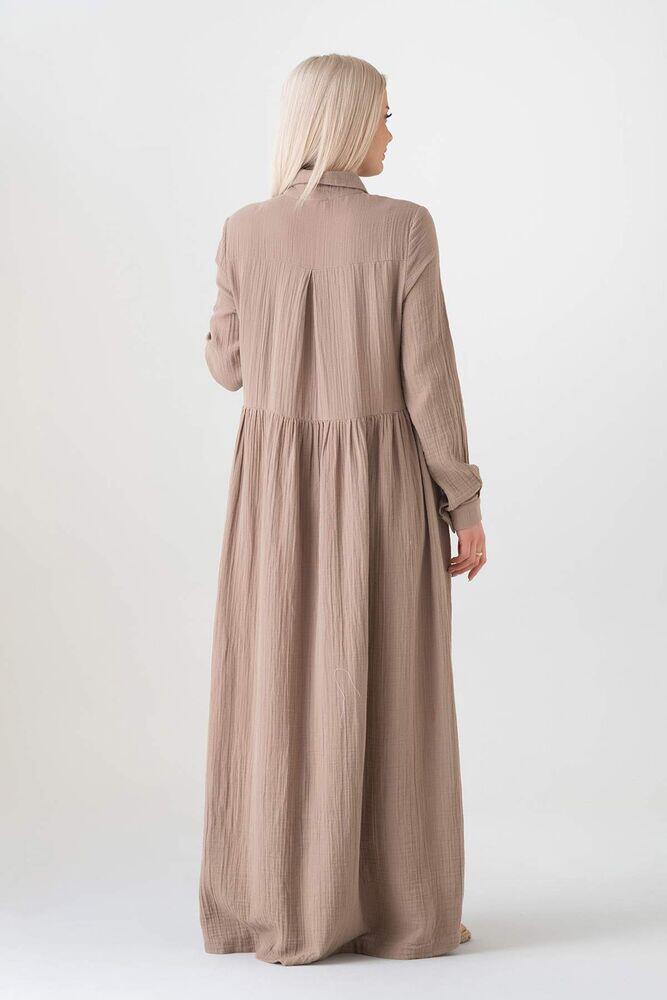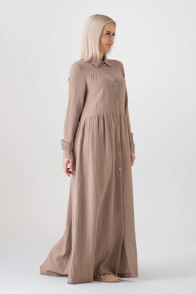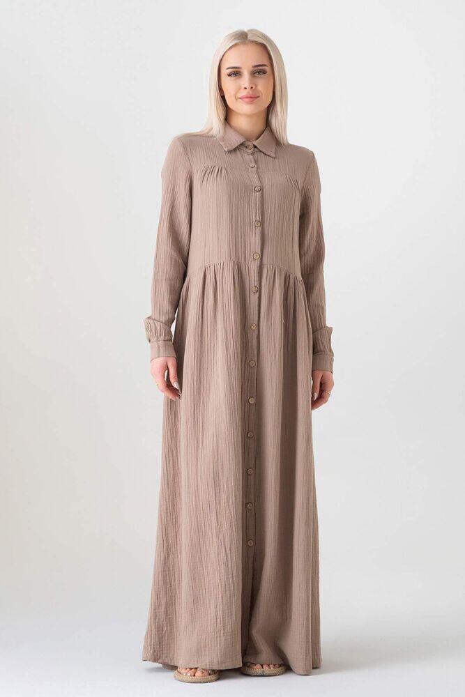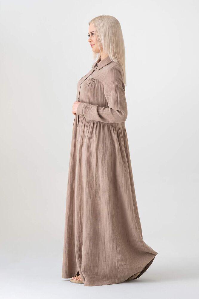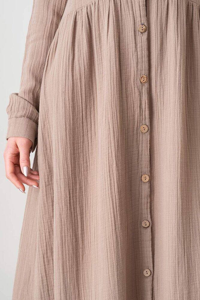 Müslin Kumaş Önden Düğmeli %100 Doğal Pamuk Kumaş Yazlık Uzun Tesettür Elbise - Vizon - WNR2521
