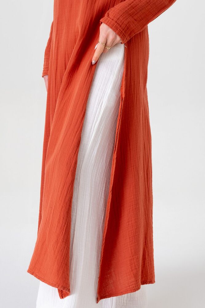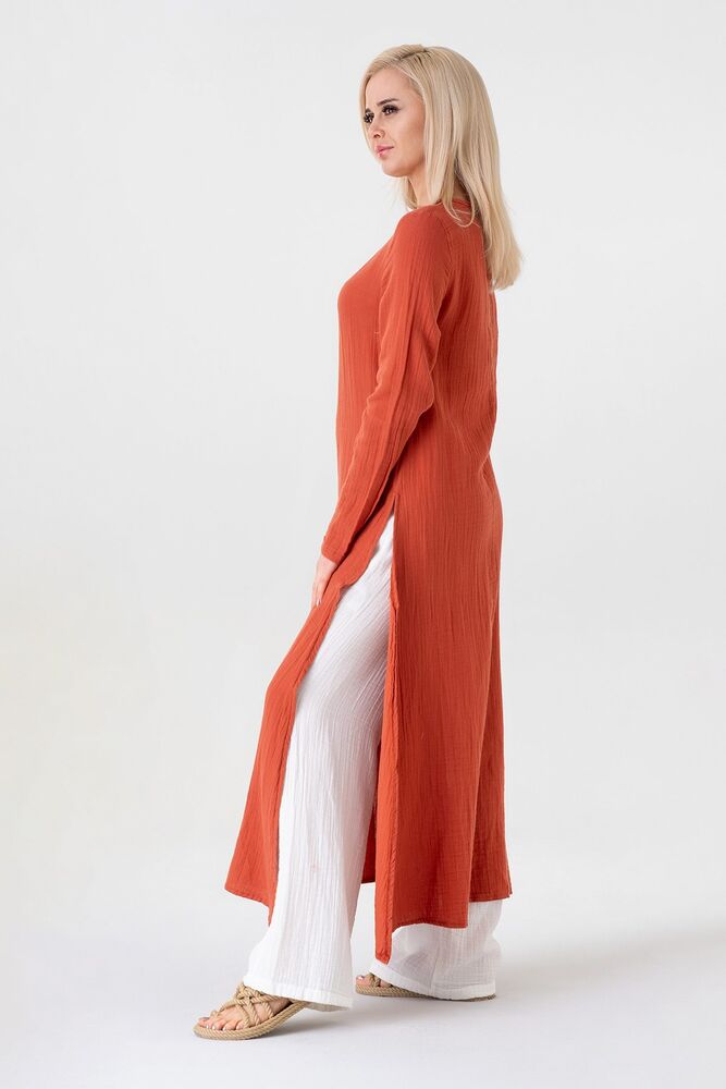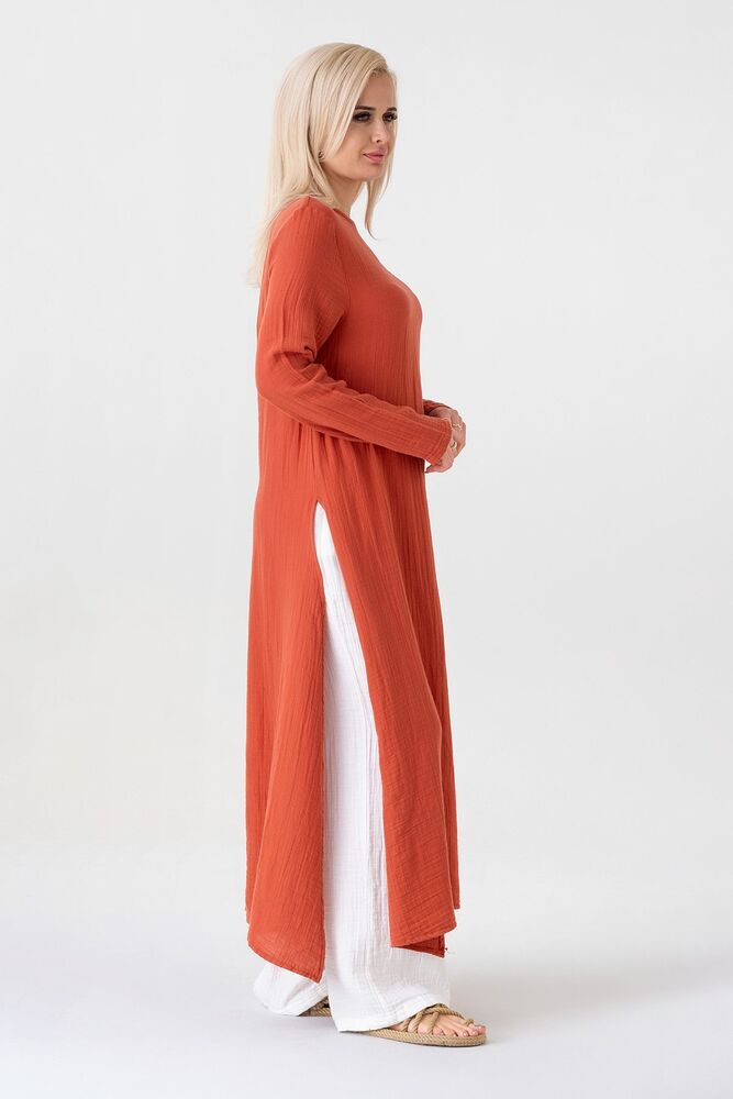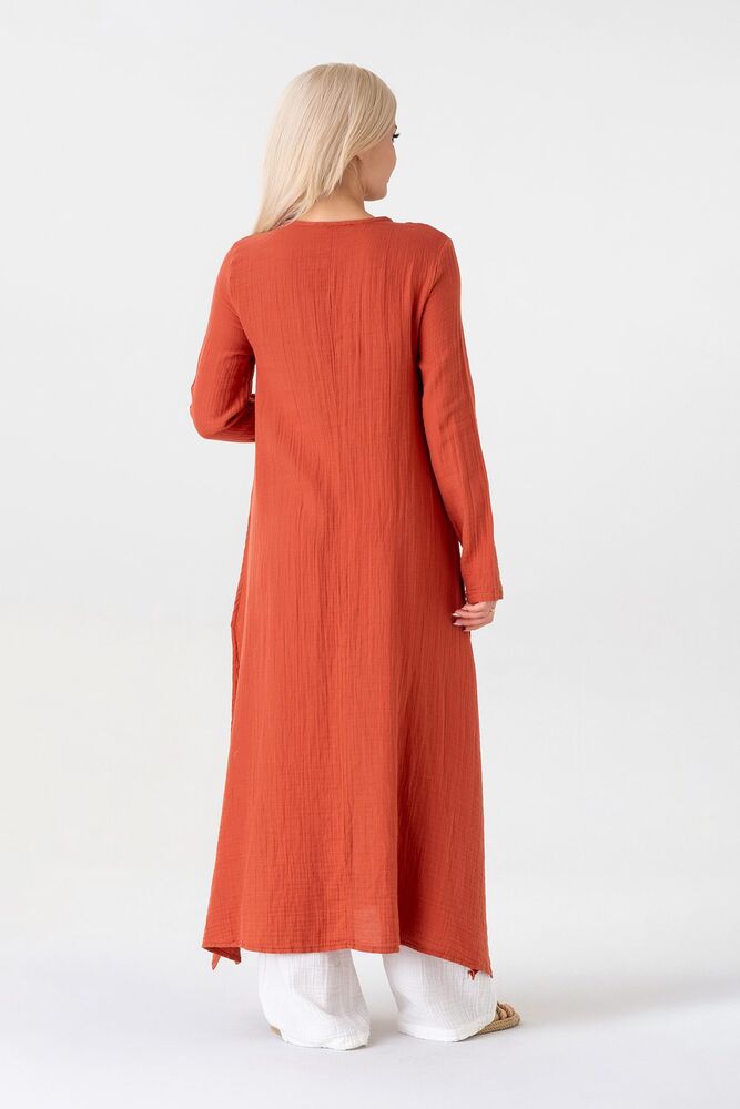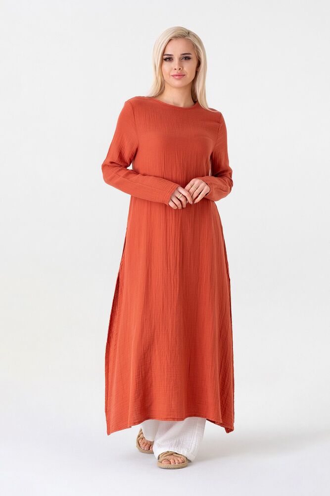 Müslin Kumaş Yandan Yırtmaçlı %100 Pamuk Tesettür Tunik - Kiremit - WNR2501