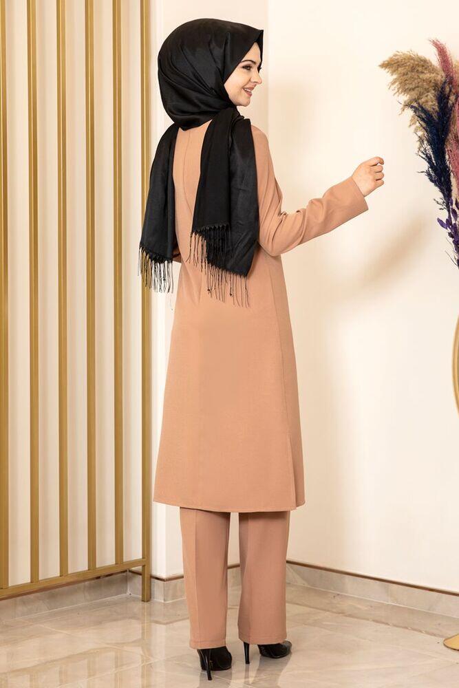 Dabıl krep kullanılarak üretilmiştir. içerisinde bulunan tunik görünümlü parça birleşiktir. Rahat kalıptır ve kendi bedeninizde sipariş vermeniz önerilir. Tunik boyu 120 cm, Pantolon Boyu 105 cm. Manken boyu 178 cm dir.