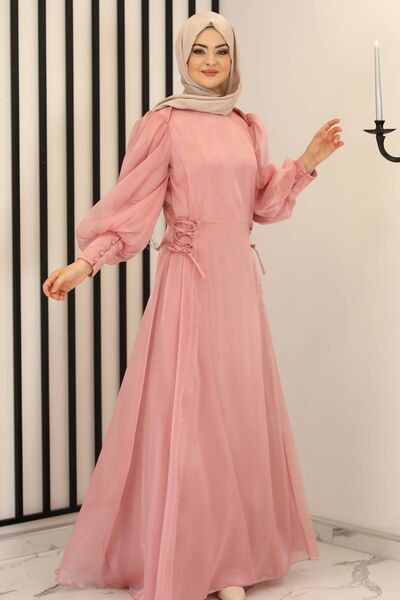 Nil Yandan Bağcıklı Tesettür Abiye Elbise