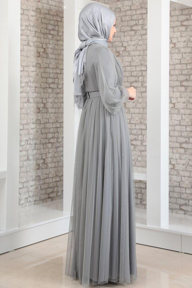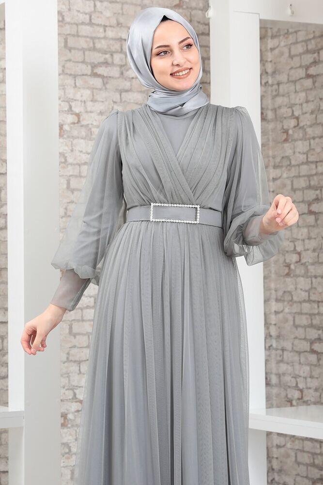 Robe de Soirée - Tulle Détaillé - Ceinture Détaillée Pierre - Gris - MDV2042 |