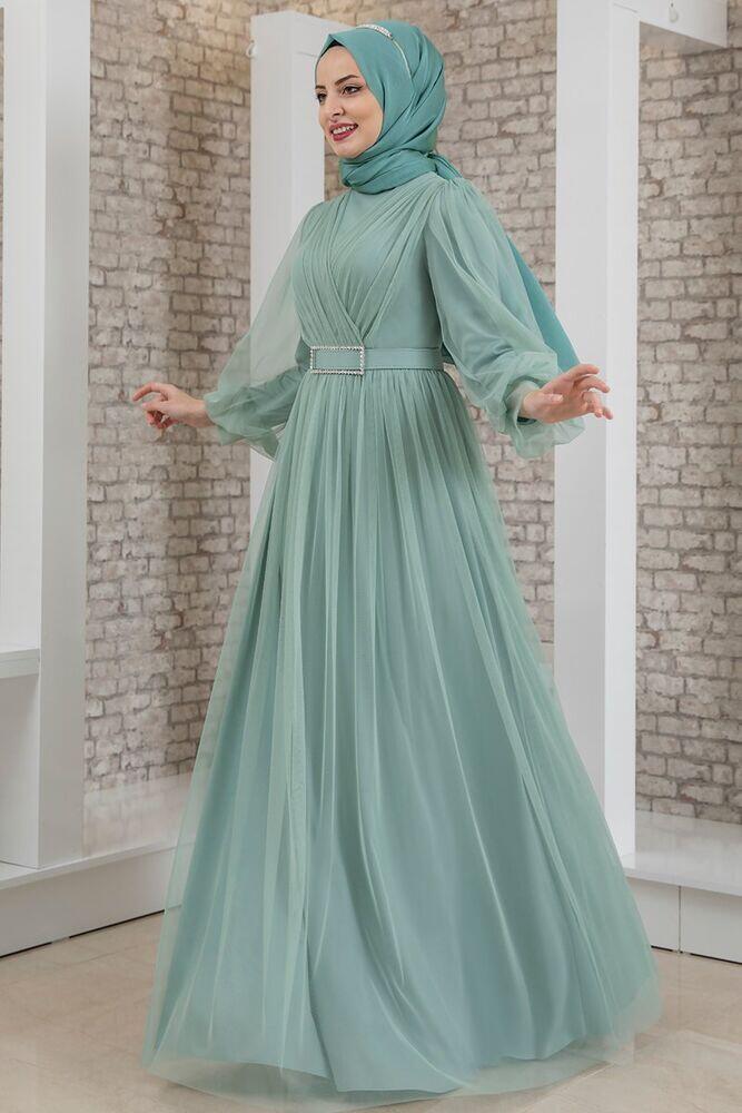 Robe de Soirée - Tulle Détaillé - Ceinture Détaillée Pierre - Menthe - FSC2020 |