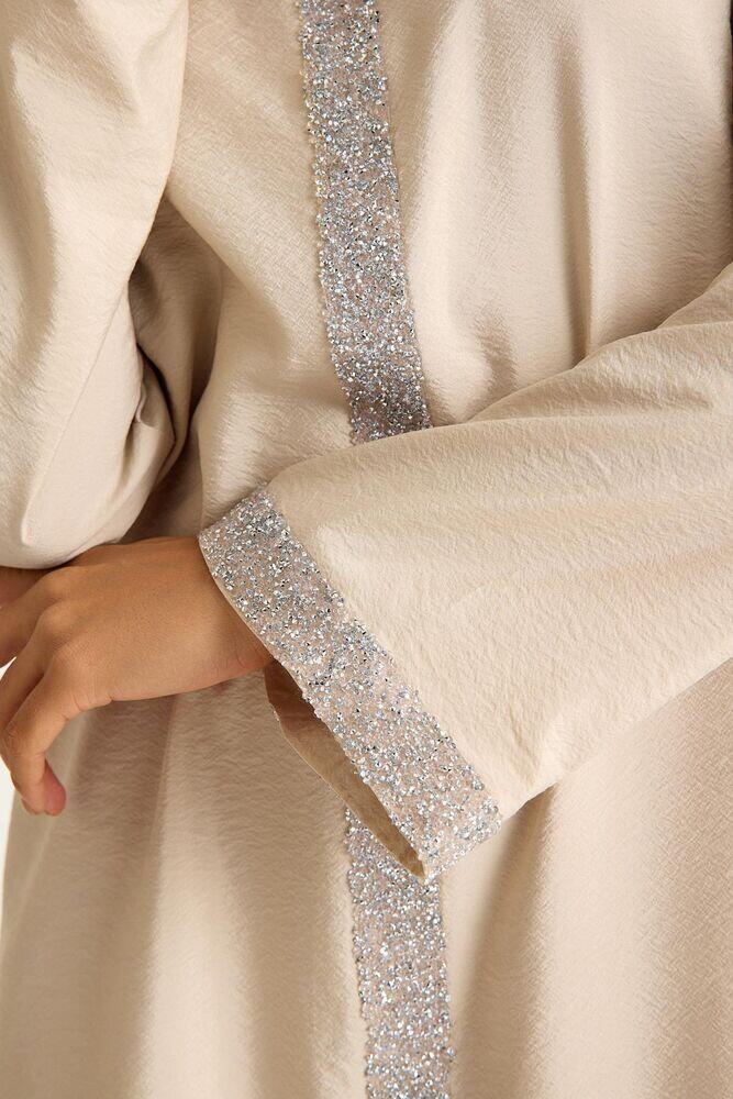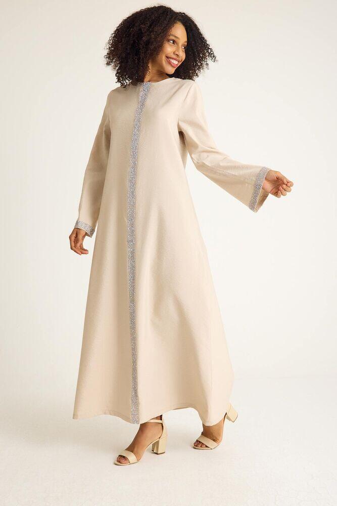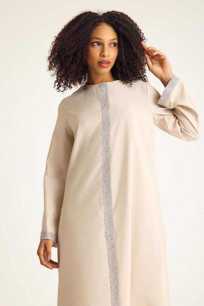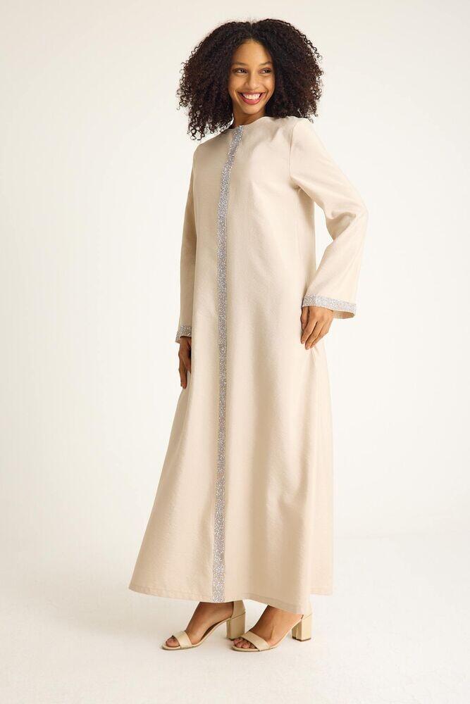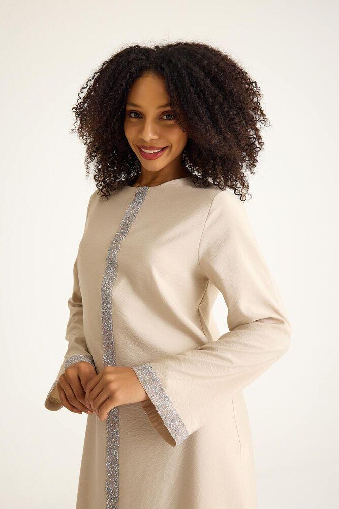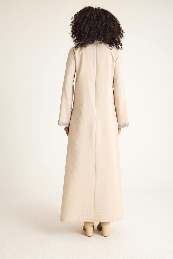 Taş Detaylı Abaya Tesettür Ferace Elbise - Bej - FSC3137
