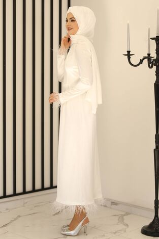 Tüy Detay Saten Kalem Abiye Elbise Ekru - Fashion Showcase Design - FSC3016