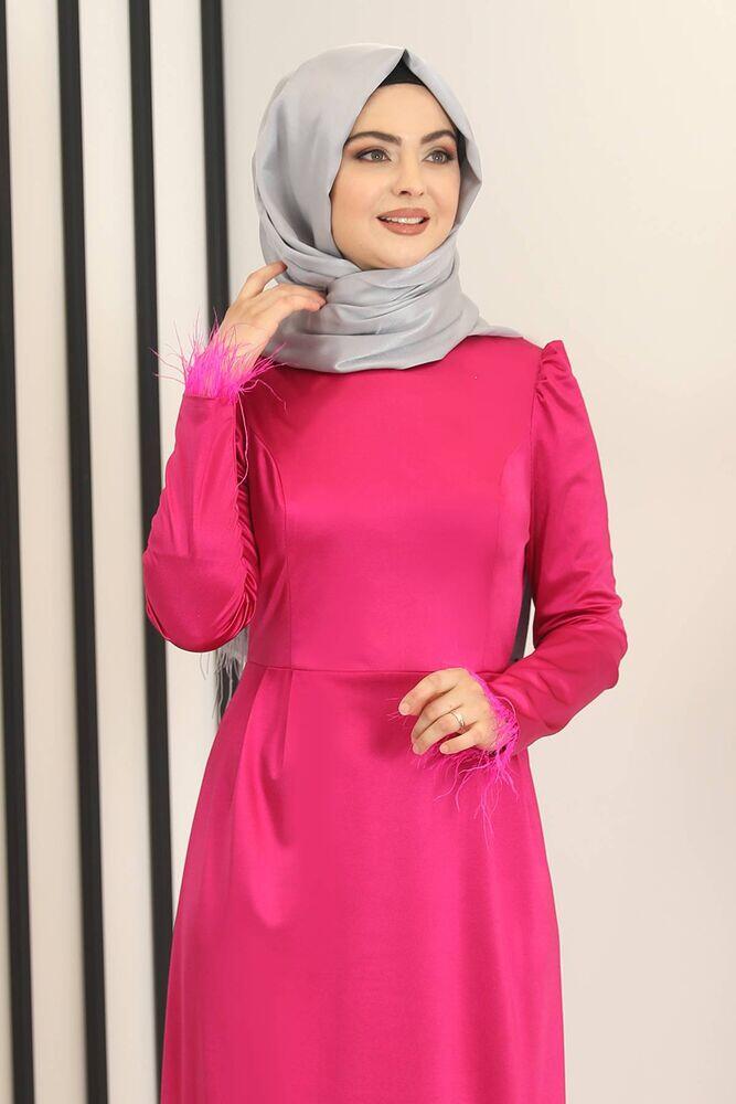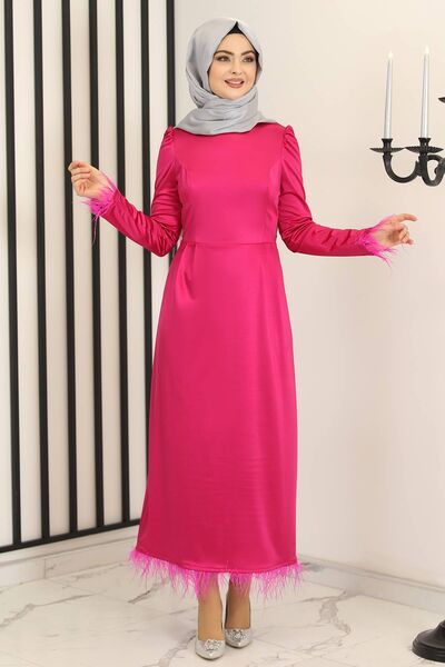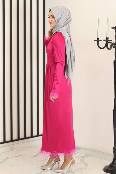 Tüy Detay Saten Kalem Abiye Elbise Fuşya - Fashion Showcase Design - FSC3016