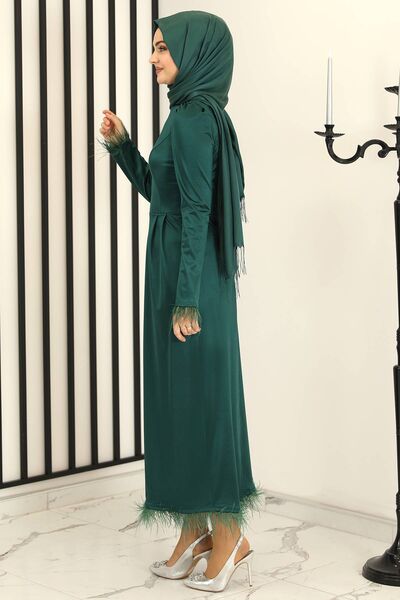Tüy Detay Saten Kalem Abiye Elbise Zümrüt - Fashion Showcase Design - FSC3016